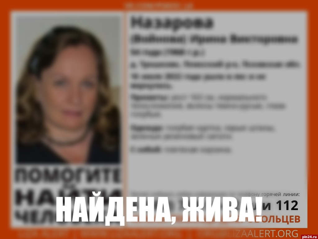 54-летняя Ирина Назарова (Войнова), которая пропала в деревне Трошкого Плюсского района, найдена живой. Об этом сообщается в группе регионального отделения поискового отряда «ЛизаАлерт» в социальной сети «ВКонтакте».