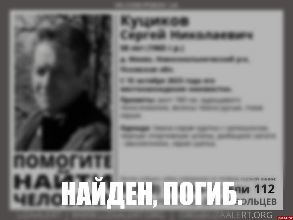 58-летний Сергей Куциков, который пропал в деревне Маево Новосокольнического района, погиб. Об этом сообщается в группе регионального отделения поискового отряда «ЛизаАлерт» в социальной сети «ВКонтакте».