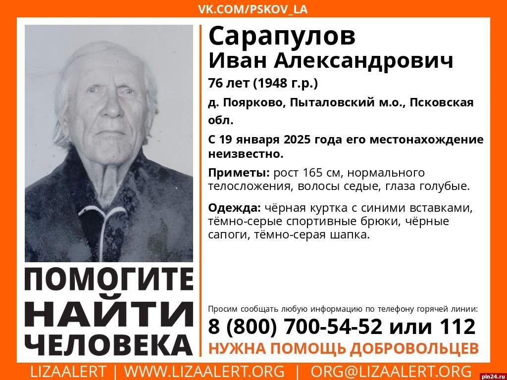 76-летний Иван Сарапулов пропал в деревне Поярково Пыталовского муниципального округа, сообщили Псковской Ленте Новостей в региональном отделении поискового отряда «ЛизаАлерт». С 19 января его местонахождение неизвестно.