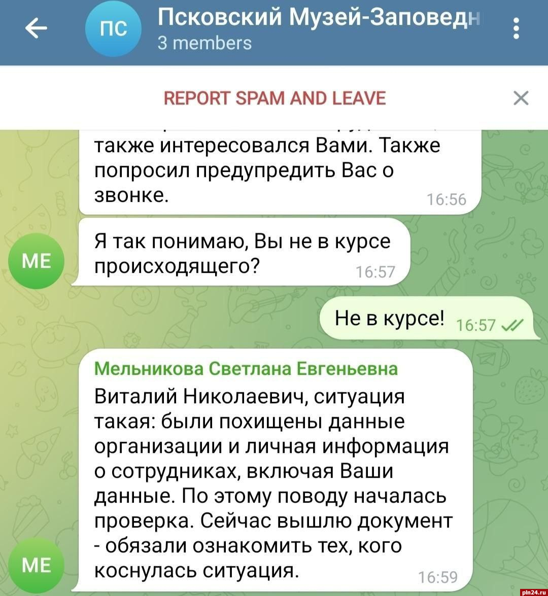 Мошенническая рассылка о краже персональных данных сотрудников Псковского музея-заповедника распространяется в Telegram через фейковый аккаунт директора музея Светланы Мельниковой.