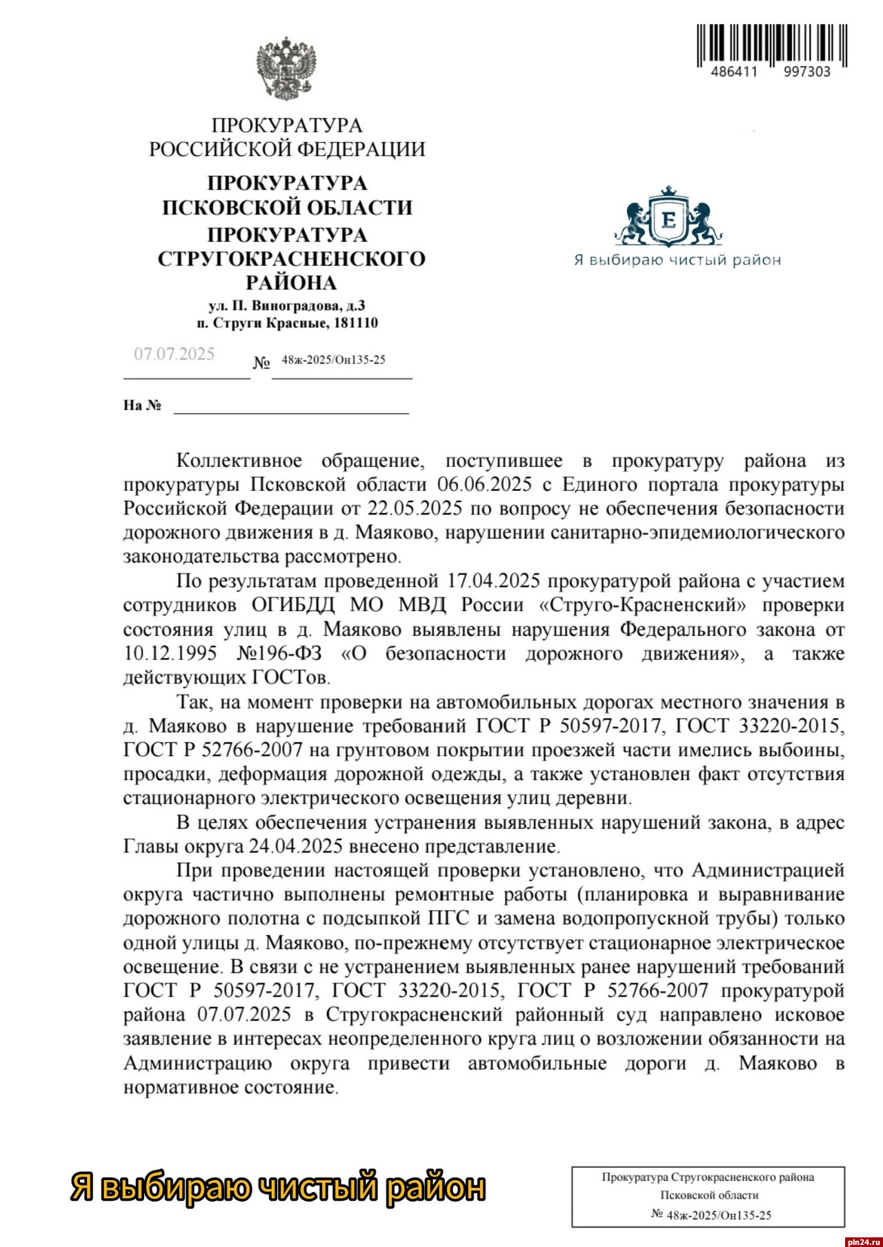 В связи с неустранением выявленных ранее нарушений требований ГОСТ Р 50597-2017, ГОСТ 33220-2015, ГОСТ Р 52766-2007 прокуратура района 7 июля в Стругокрасненский районный суд направила исковое заявление о возложении обязанности на администрацию округа привести автомобильные дороги деревне Маяково в нормативное состояние и сделать освещение.