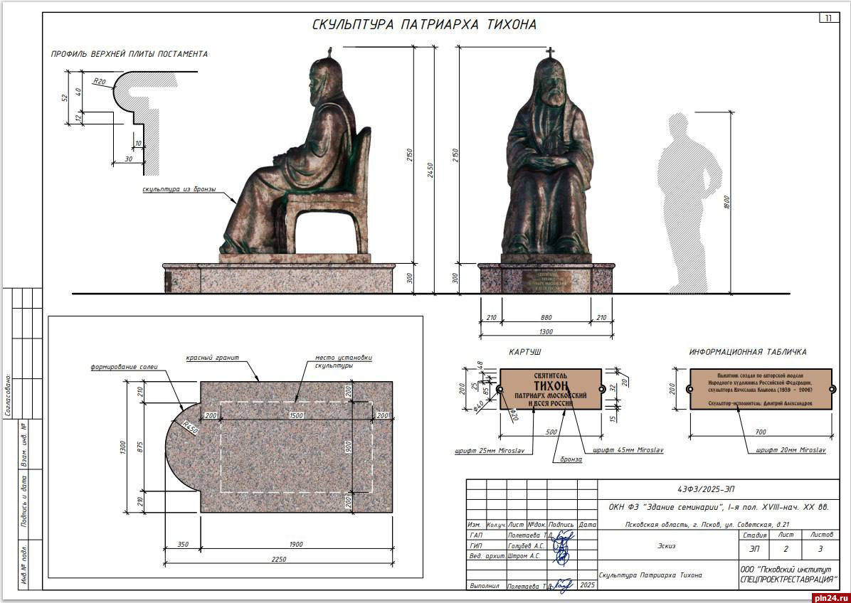 Памятник расположится у стен Псковской семинарии, где более века назад начинался путь служения Богу святителя Тихона. Высота памятники будет превышать два с половиной метра. Проект получил одобрение совета.