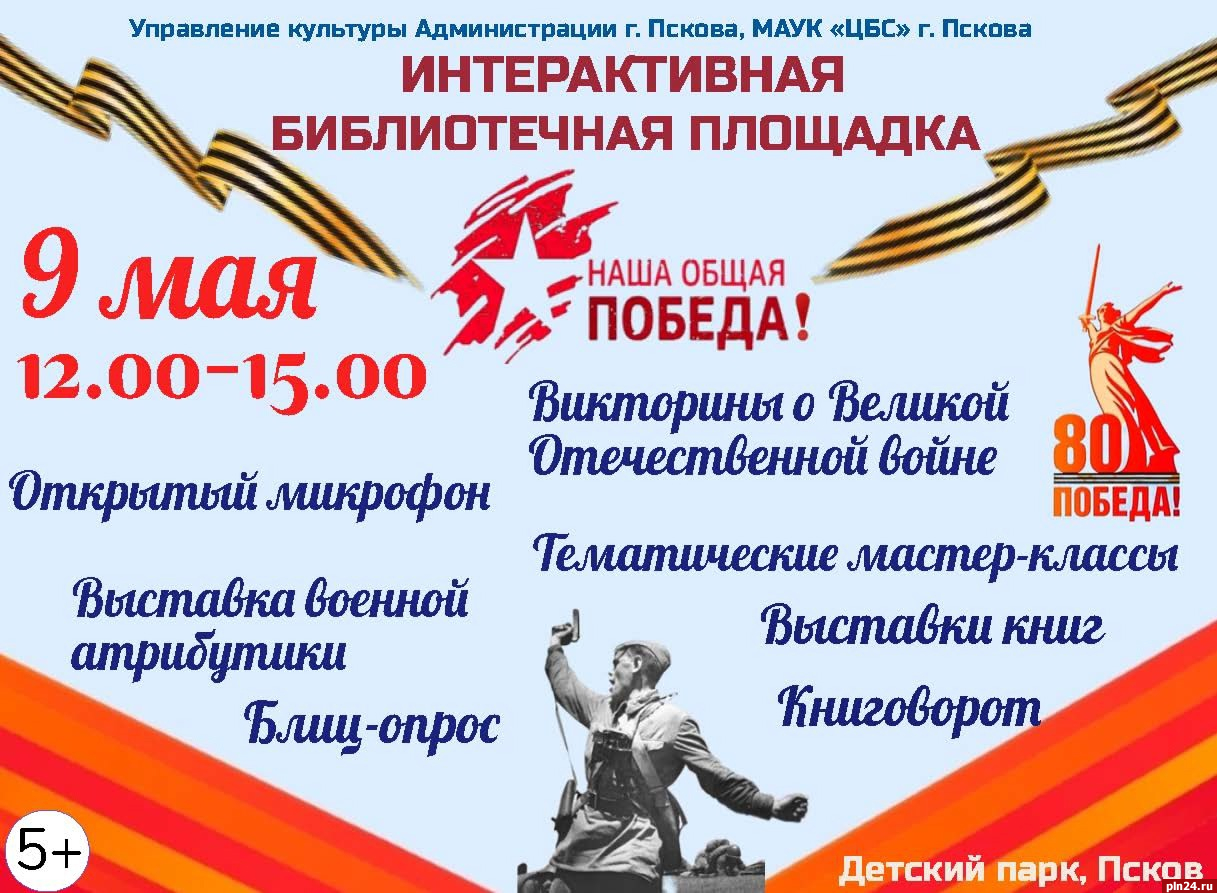 Библиотеки Пскова приглашают горожан и гостей города на акцию «Наша общая Победа!», посвященную 80-й годовщине Победы советского народа над немецко-фашистскими захватчиками в Великой Отечественной войне. Как сообщили Псковской Ленте Новостей в Централизованной библиотечной системе Пскова, акция будет проходить 9 мая с 12.00 до 15.00 в Детском парке на интерактивной информационной площадке. Всё это время там будет работать «открытый микрофон».