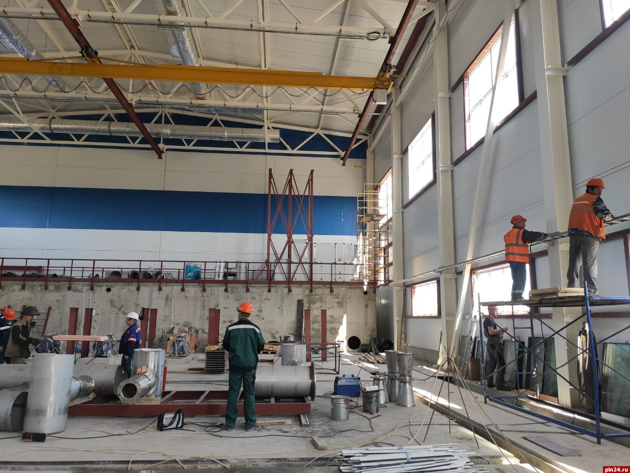 В настоящее время выполнены работы по установке закладных для прохода трубопровода; смонтированы колонны металлокаркаса здания, проведено бетонирование цоколя; выполнены работы по монтажу стеновых сэндвич-панелей и кровельных сэндвич-панелей; завершены работы по монтажу подкрановых путей здания станции умягчения; выполнены работы по монтажу БКТП и устройству заземления; полностью выполнены работы по нанесению огнезащиты. Канализационная насосная станция доставлена на объект.