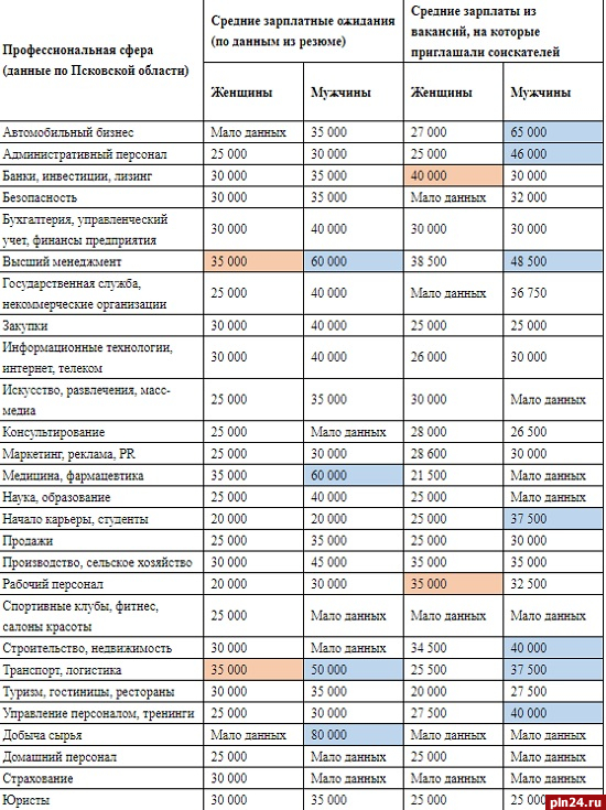 Так, в банковской мужчин из Псковской области приглашают пройти собеседование на работу, которая сулит зарплату в 30 тысяч рублей, а для местных женщин-соискателей в данной сфере зарплатные условия чуть выше – на 10 тысяч. В сфере бухгалтерии для соискателей обоих полов зарплатные предложения равные – 30 000 рублей. Такая же ситуация в юридической и производственных сферах – по 25 и 35 тысяч рублей соответственно. Кроме того, в сфере рабочего персонала и консультировании местным женщинам-соискателям работодателями предлагается зарплата на несколько тысяч выше, чем мужчинам.