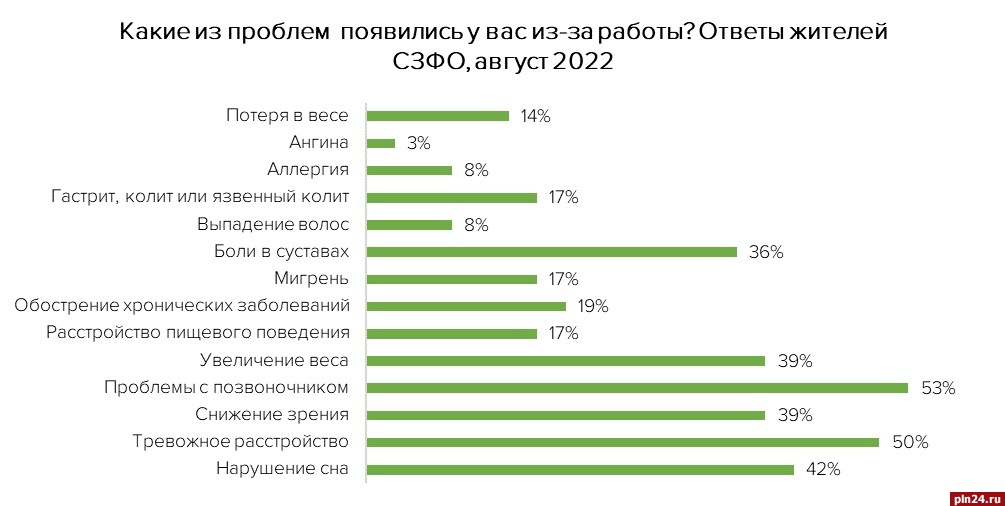 Аналитики отметили, что это самый высокий показатель по стране: в ходе опроса о влиянии работы на здоровье заявили 75% россиян. В свою очередь сказали о том, что пока не чувствуют влияния на здоровье, лишь 8% респондентов из СЗФО, остальные затруднились ответить.