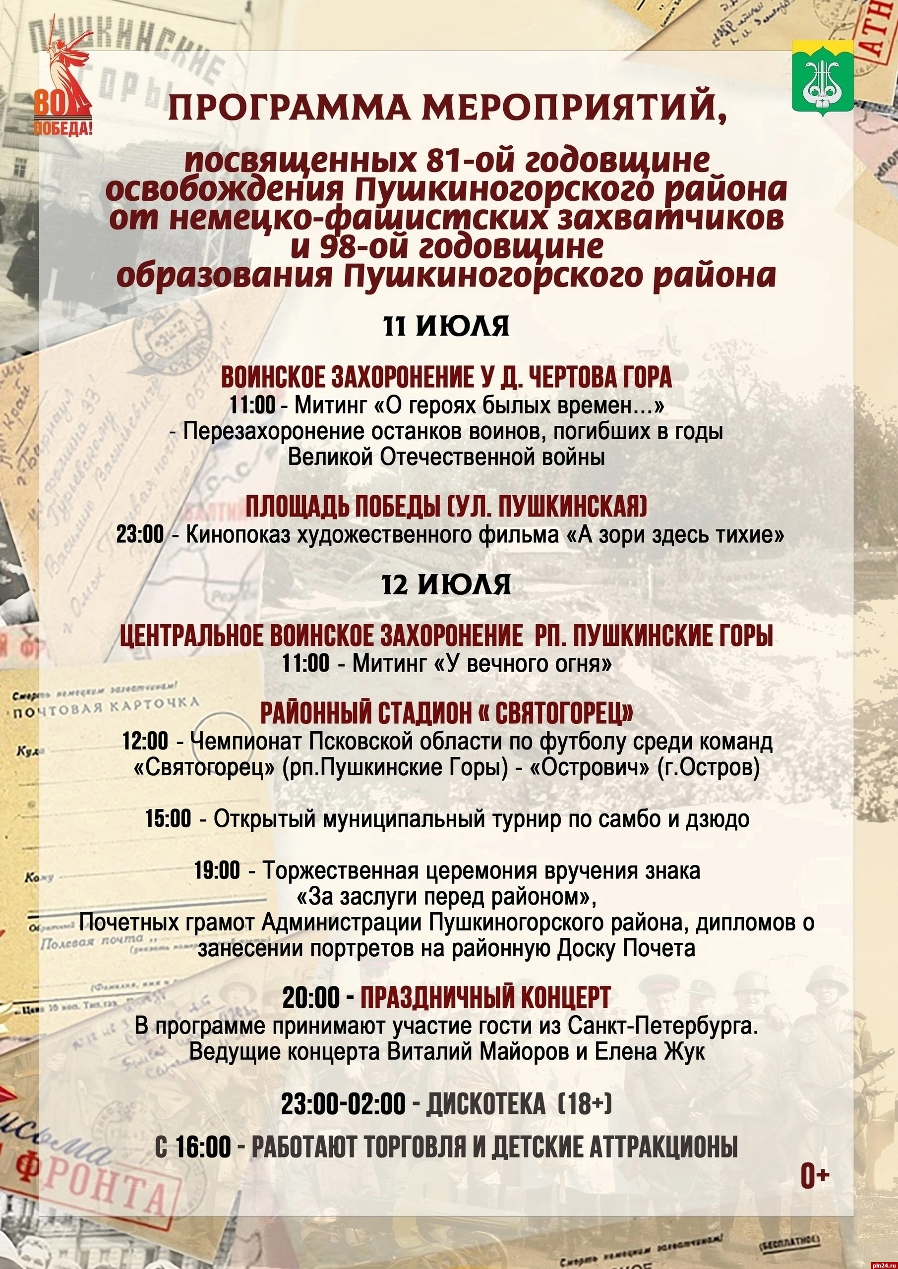 12 июля Пушкиногорский район отмечает 81-ую годовщину со дня освобождения от немецко-фашистских захватчиков, сообщила глава Пушкиногорского района Оксана Филиппова на своей странице «ВКонтакте».