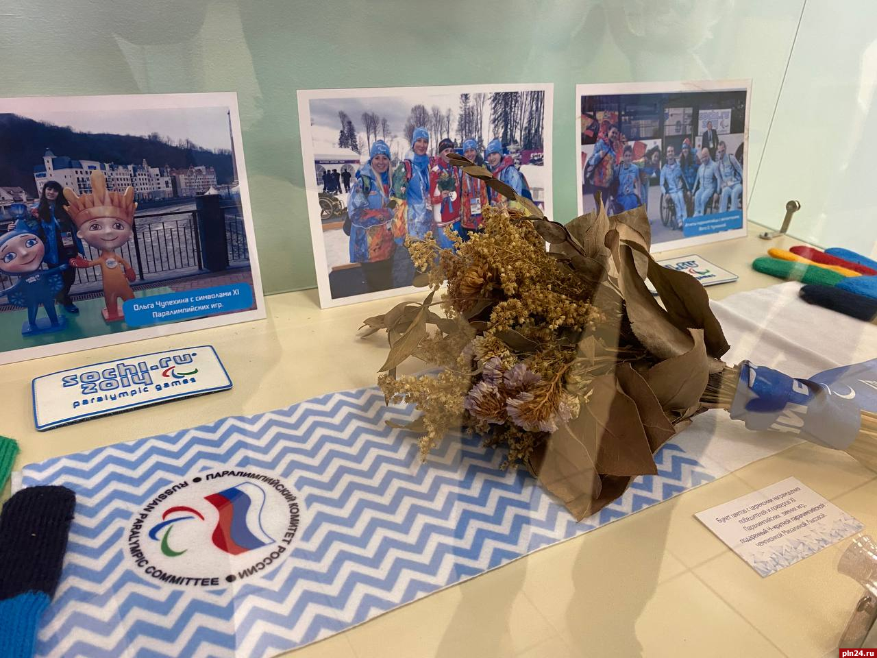 Ещё один интересный экспонат - букет цветов с церемонии награждения победителей и призеров XI Паралимпийских зимних игр, подаренный 4-кратной чемпионке Михалине Лысовой. Его привезла студентка кафедры лыжного спорта Анастасия Фёдорова, которая в качестве волонтёра принимала участие в церемонии награждения. В какой-то момент в её руках оказался букет, обладательница которого скрылась из вида, в итоге цветы прибыли в Великие Луки и заняли достойное место в музее.