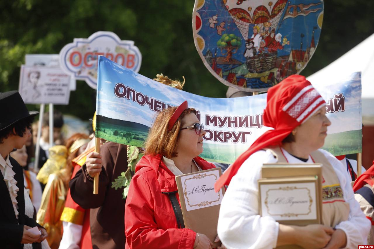 Праздничное шествие фольклорных коллективов прошло в честь Дней Пушкинской поэзии и русской культуры в музее-заповеднике «Михайловское» 7 июня, передает корреспондент Псковской Ленты Новостей.