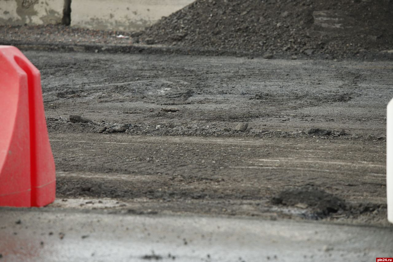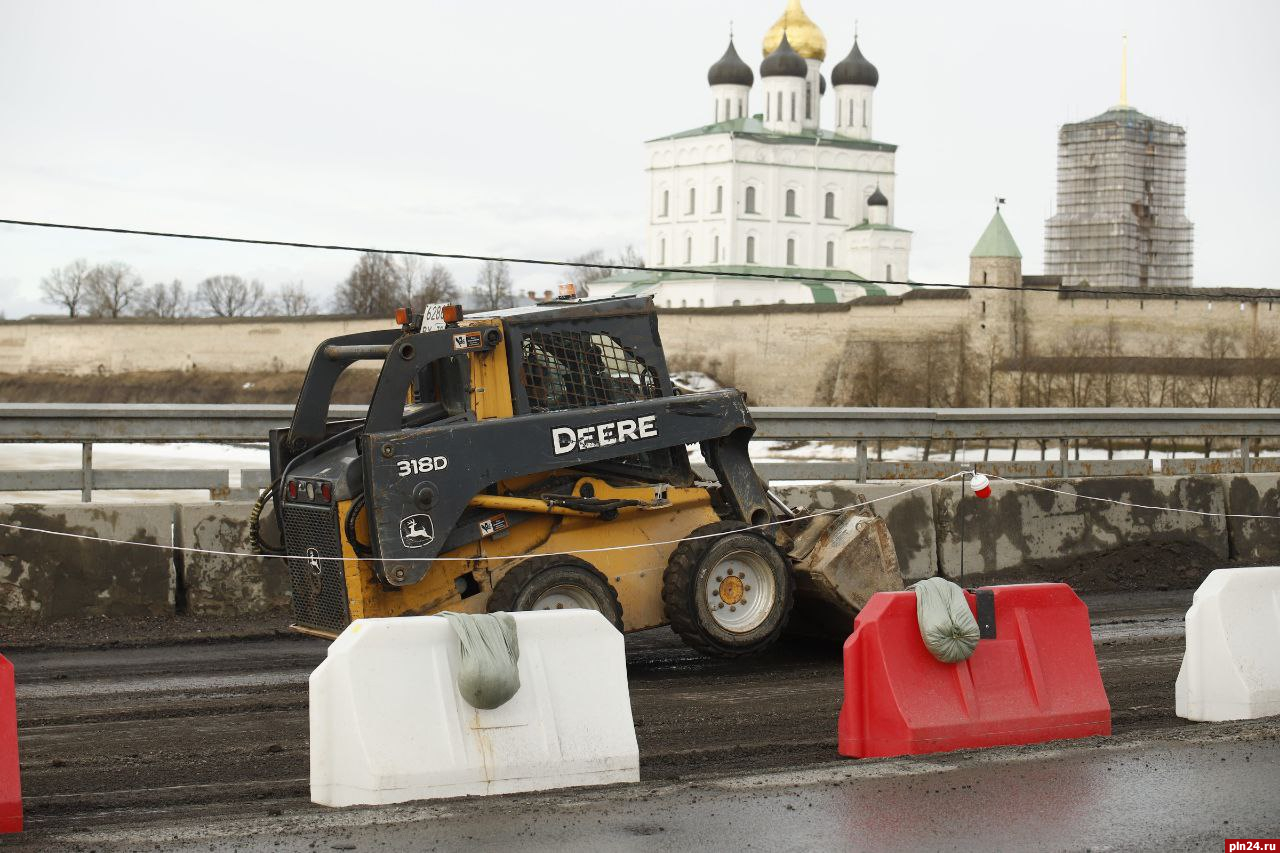 Рабочие проводят фрезеровку асфальтобетонного покрытия на Ольгинском мосту в Пскове сегодня, 15 марта, передает корреспондент Псковской Ленты Новостей.