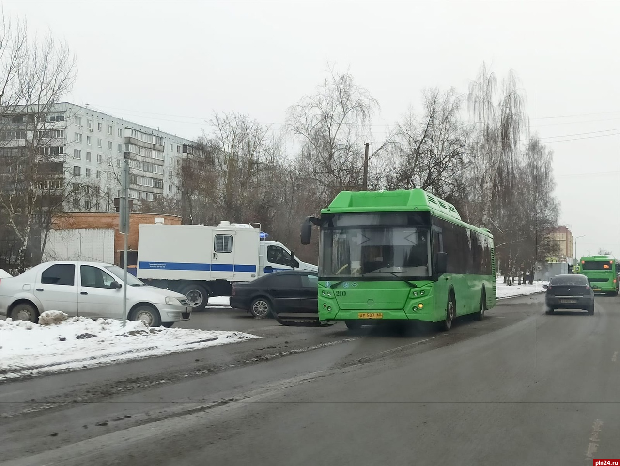 ДТП с участием автобуса произошло у дома на улице Труда, 49 в Пскове, передает корреспондент Псковской Ленты Новостей.