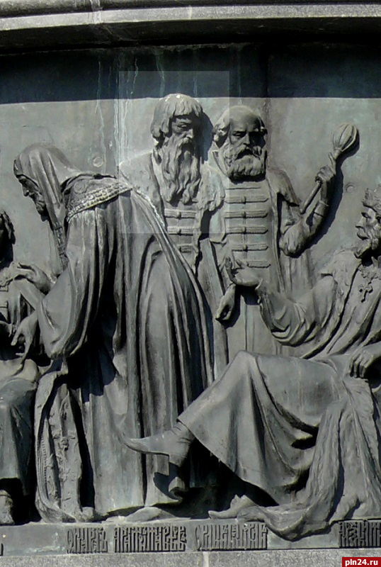 Ордин-Нащокин (слева с длинной бородой) на памятнике «Тысячелетие России» в Великом Новгороде, где представлены фигуры наиболее выдающихся государственных деятелей.