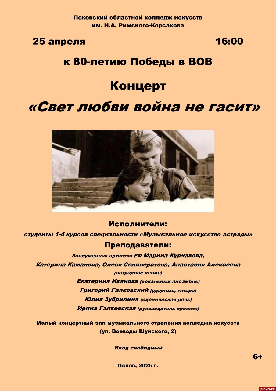 Концертную программу «Свет любви война не гасит», посвящённую 80-летию Победы в Великой Отечественной войне, подготовили вокалисты Псковского областного колледжа искусств им. Н.А. Римского-Корсакова. Об этом Псковской Ленте Новостей сообщили в колледже.