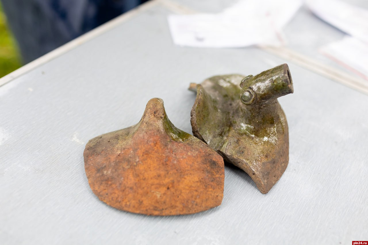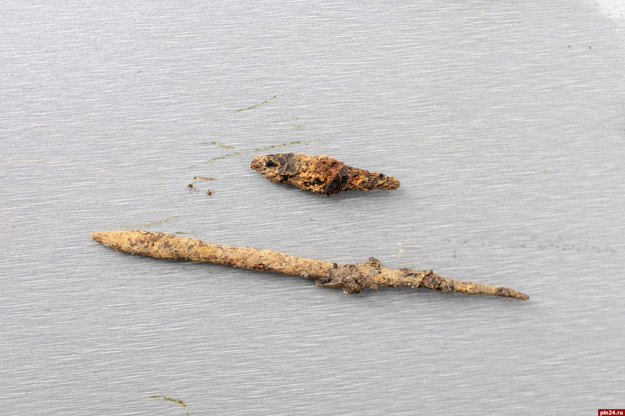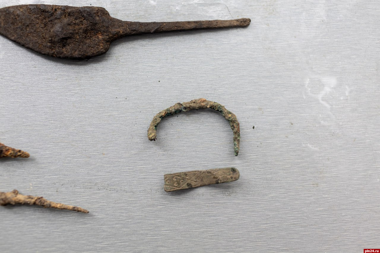 Из предметов личного пользования археологи обнаружили ременные пряжки, язычки, а также накладку на ремень. Пока, по словам Ирины Аракчеевой, она «в немножко неприглядном виде». Но к традиционной археологической выставке по итогам сезона она будет почищена и возможно даже посетители увидят, что на ней изображено. Может, Довмонт?