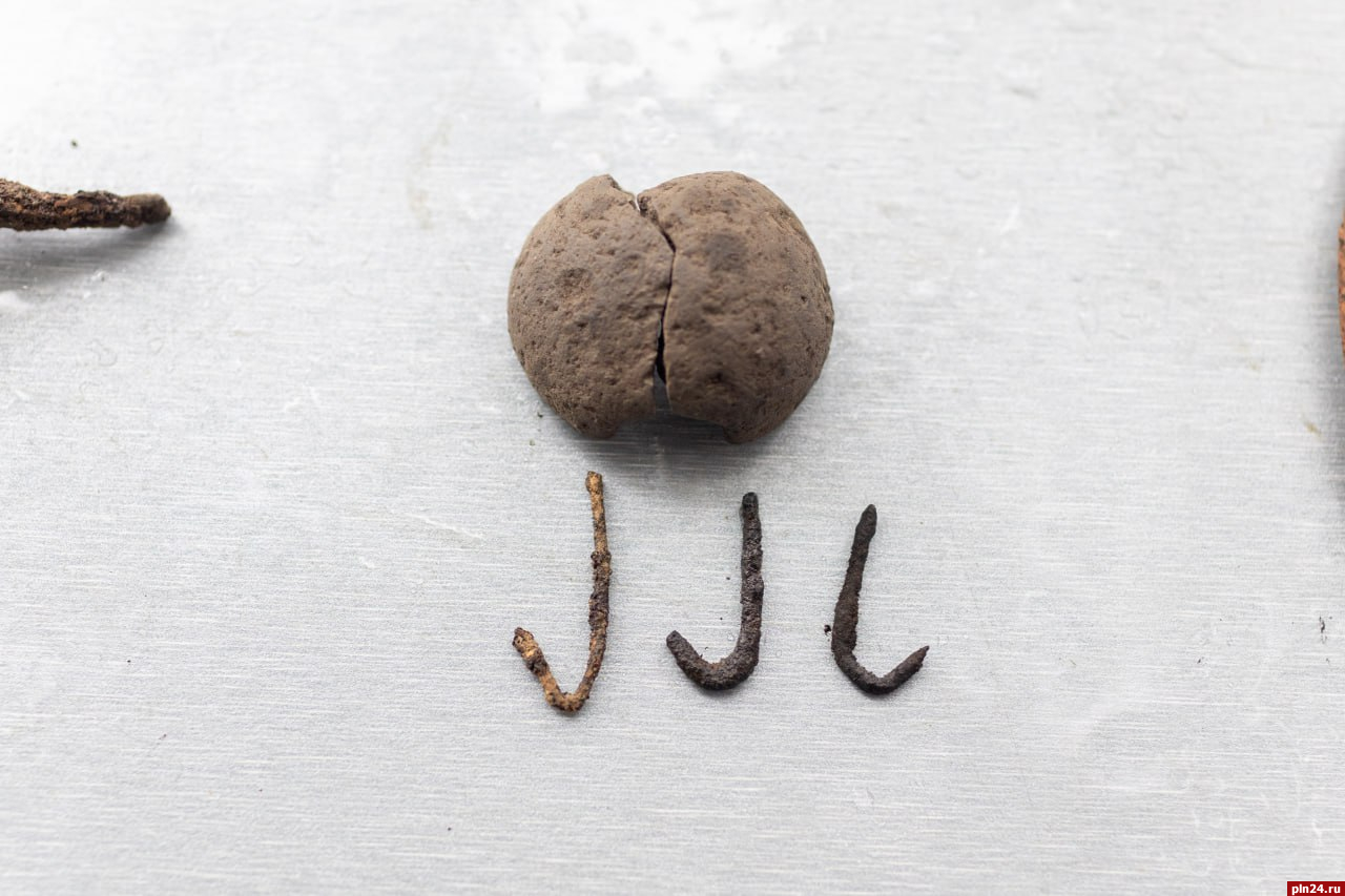 В раскопе выявлено керамическое сетевое грузило и несколько рыболовных крючков, а в слое под печью - большое скопление чешуи рыбы. «Неимоверно большое ее количество говорит о том, что рыбной ловлей здесь занимались очень активно. При том, что мы находимся на берегу Псковы, которая впадает в Великую прямо здесь», - рассказала Ирина Аракчеева.