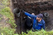 Погода работе не помеха: археологи трудятся, в том числе, под дождем. Кропотливо снимают слой за слоем земли, перебирают его вручную и отправляют грунт наверх, где он «прощупывается» металлодетектором. И раскоп преподносит сюрпризы в виде больших и маленьких открытий.