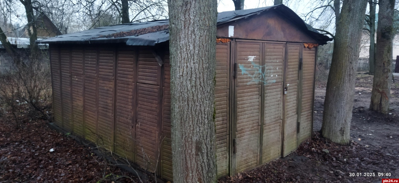 Гараж располагался на улице Александра Невского, напротив дома № 15, в границах кадастрового квартала 60:27:0060251. Сооружение имело стены ржаво-коричневого цвета, двухскатную крышу и двухстворчатые ворота, общая площадь составляла около 18 квадратных метров.
