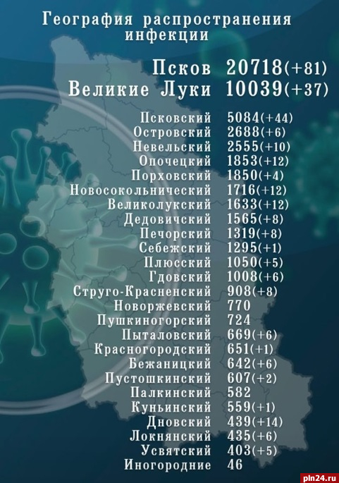 За прошедшие сутки коронавирусом в Псковской области заразились 295 человек, всего - 61 808 человек. Выздоровели в регионе с начала пандемии 53 089 пациентов, за сутки от болезни избавился 201 человек. Жертвами COVID-19 в области стали 973 человека.