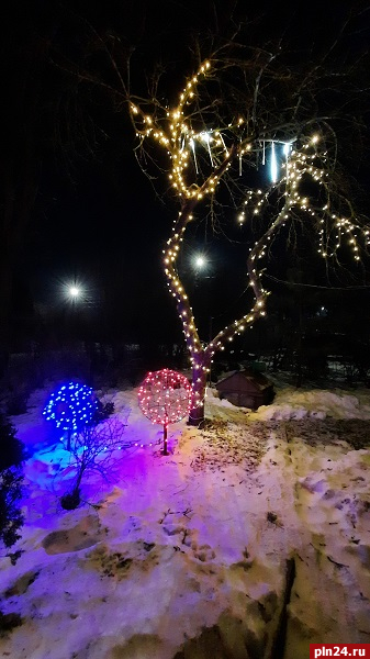 Еще одна заявка в этой же номинации поступила от Владимира Морхова. Он украсил к празднику свой дом на улице Ларионова, 8 в Пскове и стоящие рядом деревья.