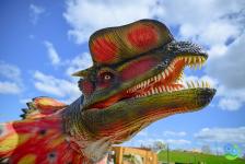 В псковском парке динозавров чуть больше, чем в великолукском. Здесь представлены животные нескольких периодов, разные по размеру фигуры. Всего в псковском «Динопарке» можно увидеть около пятидесяти видов динозавров, и все они двигаются и издают рычание и рёв.