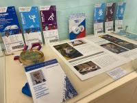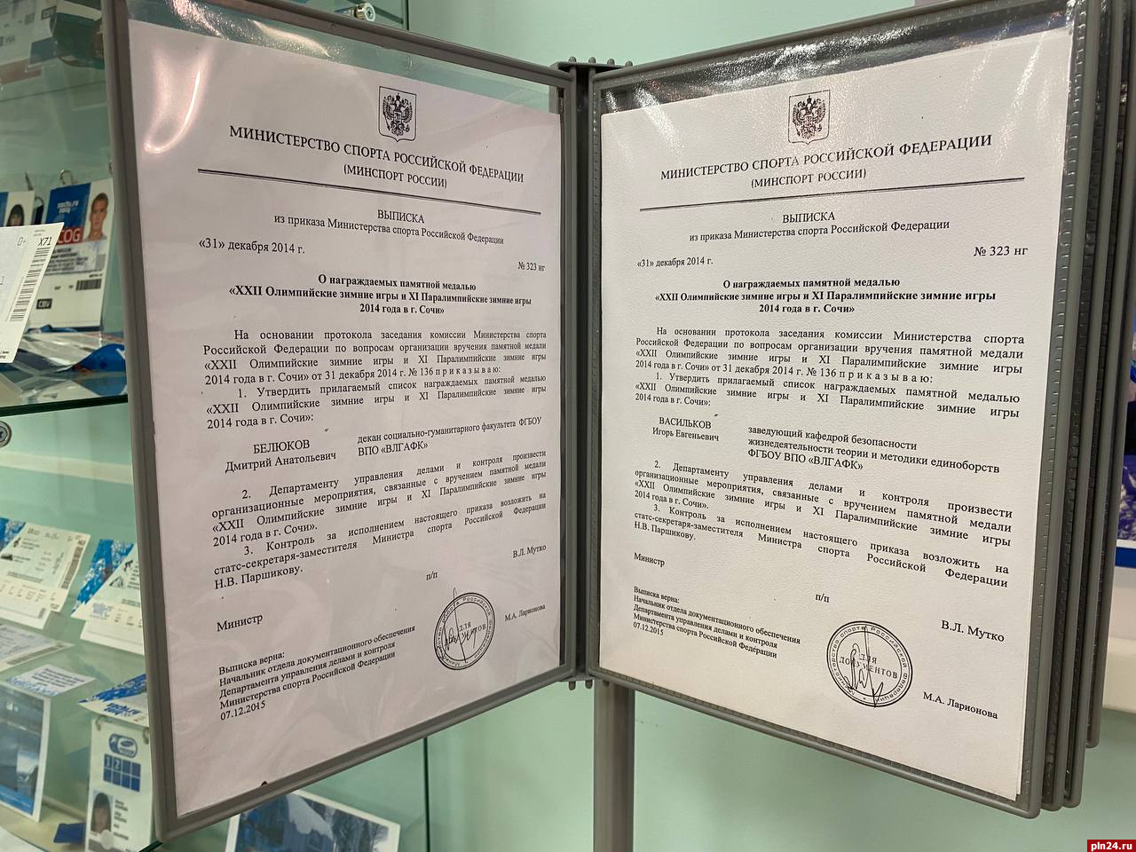 Рядом выставлены майка и сертификат участника Олимпийских зимних игр 2018 года в Пхенчхане, принадлежащие уроженцу Великолукского района, выпускнику ВЛГАФК Владиславу Марченкову, и многие другие памятные вещи, переданные псковичами-олимпийцами и их родственниками.